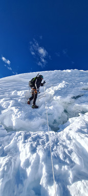 Il est 5 heures du matin et le réveil sonne comme un soulagement. Les quelques rêves que j’ai fait en somnolant se déroulaient tous sur un voilier au-delà des 50èmes hurlants. Le vent à fait battre la toile toute la nuit, nous n’avons pas vraiment dormi. Les chaussures sont dures comme du bois mais il faut bien les mettre. Il fait -10°. Se dépêcher de s’agiter car le mouvement c’est la chaleur. Rapidement après l'absorption de la tsampa fade et tiède nous montons sur les premières pentes débonnaires du Pachermo. Nous avons le plaisir de trouver des cordes fixes neuves dès que la pente s’élève un peu. Ce sommet est assez peu parcouru du fait de son éloignement relatif car, d’un côté comme de l’autre, il faut entre deux et quatre jours d’autonomie pour l’atteindre. Malgré cela, une expédition commerciale à dû passer par là plus tôt dans l’automne pour que des cordes fixes soient installées. En effet, pour sécuriser leurs clients, les guides et les sherpas installent ces lignes de vie et elles restent ensuite sur la montagne. Alors nous grimpons, essoufflés comme après un sprint infernal et pourtant à une allure d’escargot. Le vent est cinglant, nous estimons la température ressentie aux alentours des -20°. J’ai l’onglet aux mains, j’aimerais faire quelques photos mais je m’abstiens le plus souvent car il faudrait enlever les gants. Tous mes vêtements sont sur moi (à part ma Gore-Tex), y compris ma grosse doudoune et j’ai juste chaud dans l’effort. Parfois, le fil de l'arête nous fait passer côté soleil et à l’abri du vent. Nous gagnons instantanément 20°. C’est le confort. Ce même soleil que nous avons vu émerger de la ligne d’horizon constitué des plus hautes montagnes du monde dans un jeu flamboyant de couleurs célestes. Comment ne pas être ému. À quelques endroits nous sommes soulagés de trouver ces fameuses cordes, surtout lorsqu’il s’agit de franchir des petits ressauts de glace au-dessus de crevasses béantes. Cela arrive deux ou trois fois. Puis nous voila au sommet. Cela parait un peu soudain mais c’est la réalité. Nous avançons et d’un coup ce n’est plus possible, cela signifie que c’est terminé. L’alpiniste ne connaît que deux types de déplacement, l’ascension ou la descente. Nous tentons une accolade ridicule comme deux bibendums engoncés. Nous sommes heureux et pour la première fois nous voyons les sommets que nous ne savons pas encore nommer: L’Everest, le Lhotse, le Makalu, l’Ama Dablam, la liste est infinie. Et pour ceux qui se demandent ce que font les gens au sommet, la réponse est claire : rien. Car la haut il n’y a plus rien à faire qu’à redescendre et commencer à rêver au prochain. Alors nous ne dérogeons pas, nous ne restons pas. Quoique quelques mètres en dessous il y a une plateforme à l’abri du vent, nous en profitons pour nous réchauffer un peu les pieds et les mains, pour boire notre dernière lampé de génépi aussi, pour se congratuler une dernière fois et enfin pour se rappeler qu’il s’agit de redescendre, en vie.