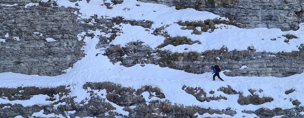 À 16h nous avons rejoint notre dernier refuge et réitérons le processus de la veille. Déchargement, garder le minimum, monter sur une crête. Nous la choisissons plein sud, au soleil, car il n’y a que les pierres qui restent inertes dans l’ombre des faces nords. Nous restons immobiles, cachés derrière un rehaussement de terrain mais pas stoïques devant le paysage. La vue à gauche s'étend sur une grande plaine éloignée, haute, blanche, défendue par une profonde forêt de conifères. Elle semble froide, belle et distante, un fantasme en somme. En face le soleil, gros, éblouissant, nécessaire. À droite un flanc de montagne entier, caressé par les derniers rayons, encore encombré de névés dans ses ondulations, crevé par une série de grottes un peu en contrebas. Une harde de chamois paisse tranquillement et s'offre à notre regard sur quelques promontoires rocheux satisfaisant ainsi l'esthétique voulue par l'œil humain. Eux n’en ont que faire. Il y a aussi cette crête arrondie que nous essayons de lire, ou nous espérons l’apparition. Nous aimerions y voir naître la silhouette du loup car c’est ici qu’il serait beau, dans le jaune du couchant. C’est dans ce genre de hauts lieux et de lumières que nous le voyons dans les films de Munier et de Jean Michel Bertrand. C’est l’instant, c’est le lieu, et pourtant il ne viendra pas. Il était peut-être juste derrière mais nul ne sait ce qui est écrit derrière la page qui n’est pas lue. Car c’est ça une crête, c’est l'extrémité de la page. C’est la tranche si fine qui laisse deviner le verso, et pourtant faut-il passer derrière pour la lire. La nature: la plus belle des littératures. Nous sommes restés là quelques heures avec la seule promesse que l’attente n'exauce pas tous les vœux. Nous étions là pour assister à un spectacle qui n’aurait sûrement pas lieu. L’affiche était claire: << Surement rien, probablement aucun passage, vous aurez froid assurément >> . La contre publicité. L’anti-modernisme. Le levier de la décroissance. Pour une fois la réclam’ était juste ! Nous rentrons à la nuit dans notre tanière heureux d’avoir essayé.